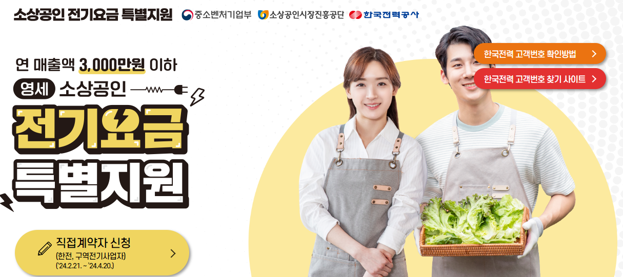 전기요금 인상으로 인해 사업을 영위하기 힘든 소상공인들을 위해 '소상공인 전기요금 특별지원'이 시행되었습니다. 2024년 2월 15일에 공고문이 발표되었고, 2월 21일부터 신청을 받고 있습니다. 사업자당 최대 20만원까지 지원을 받을 수 있다고 하니 바로 아래에 안내드린 곳에서 지원 대상 확인을 꼭 해보시기를 추천드립니다.