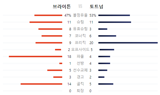 토트넘과 브라이튼의 경기 결과를 보면 엄청난 대패이지만, 볼점유율로 놓고보면 사실 비슷했던 경기 수준이였습니다. 물론 프리미어리그 4위 토트넘이 9위 브라이튼을 상대로 더 수준높은 경기를 펼쳤어야 했던 것은 사실입니다.