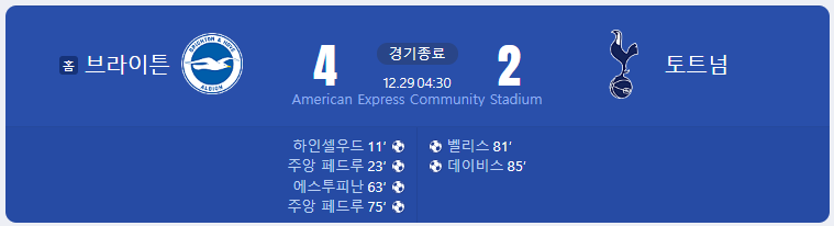 2023년 12월 29일 새벽 04:30에 진행된 토트넘과 브라이튼의 경기가 얼마나 난투극이길래 두팀 통합 6골이나 나왔을까요?