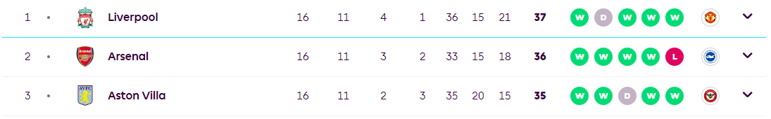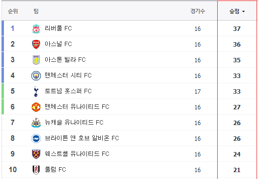 아스널도 승점 36점으로 굉장히 좋은 팀이라서 올해 맨시티의 홀란드가 부상 아웃 및 선수 개인적인 열정이 없이는 리그 1위 싸움은 리버풀과 아스널 그리고 아스톤빌라의 경쟁이지 않을까 싶습니다.