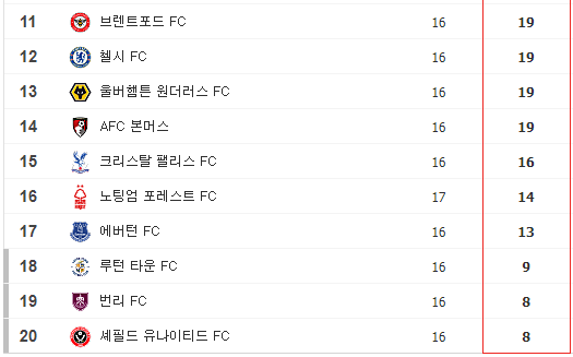 ▶프리미어리그 순위 11위부터 20위